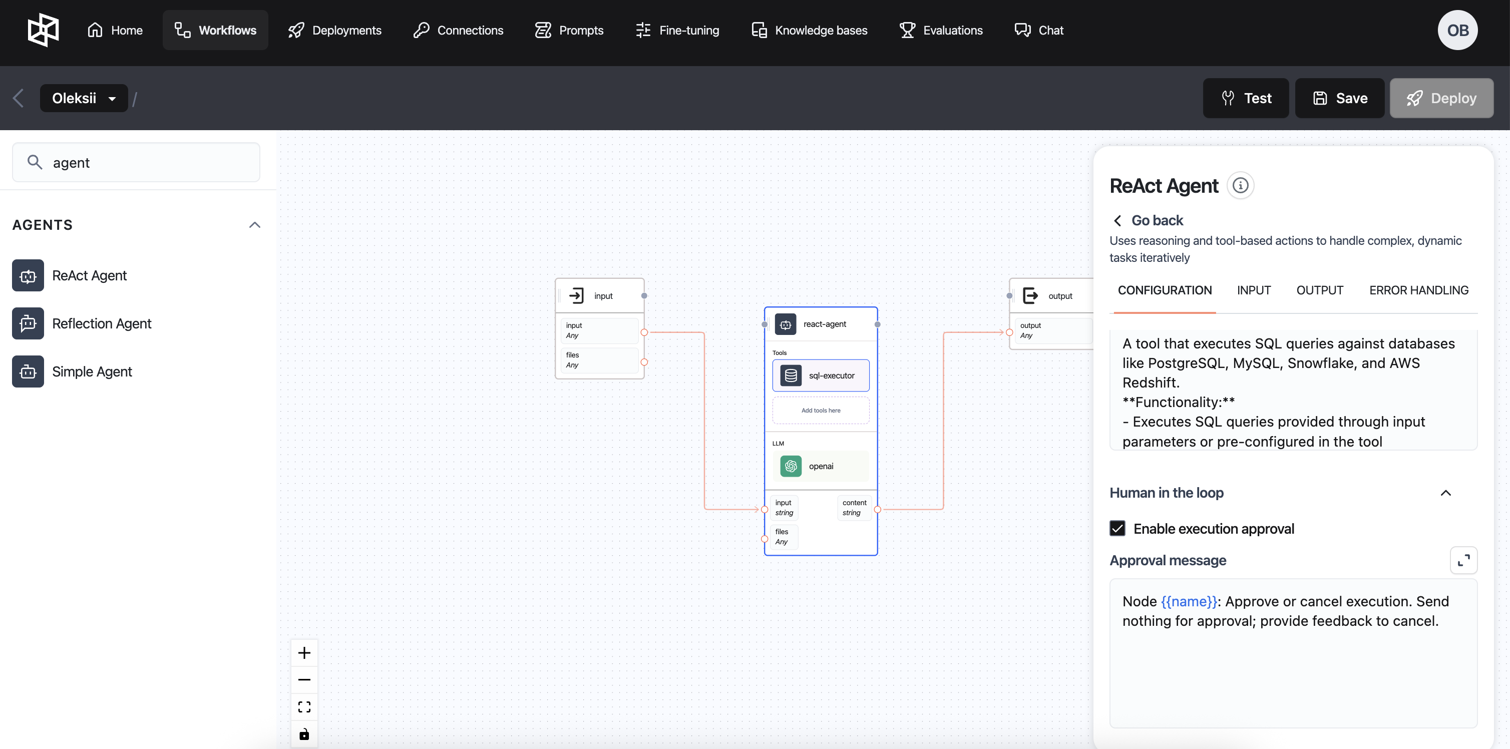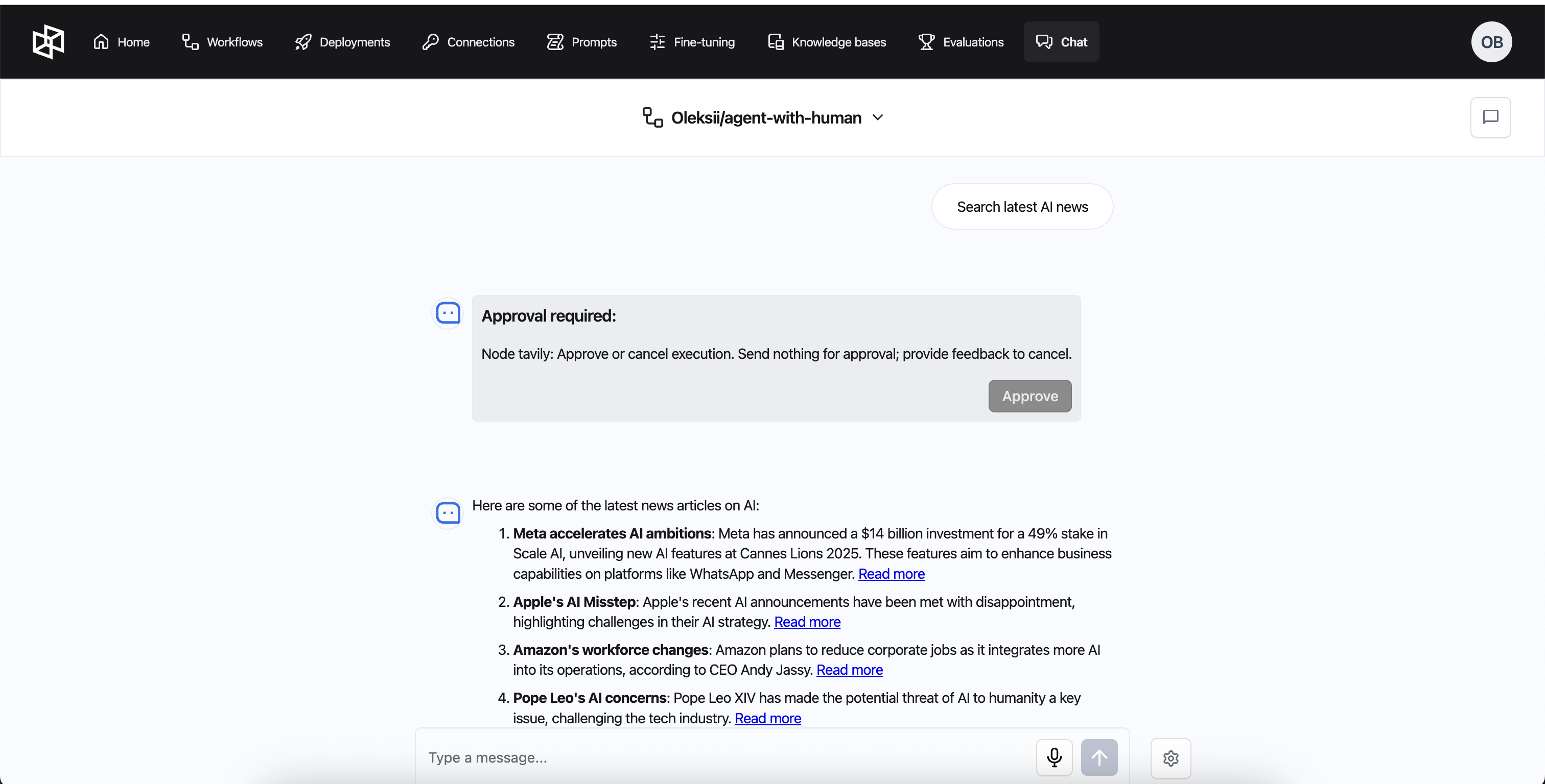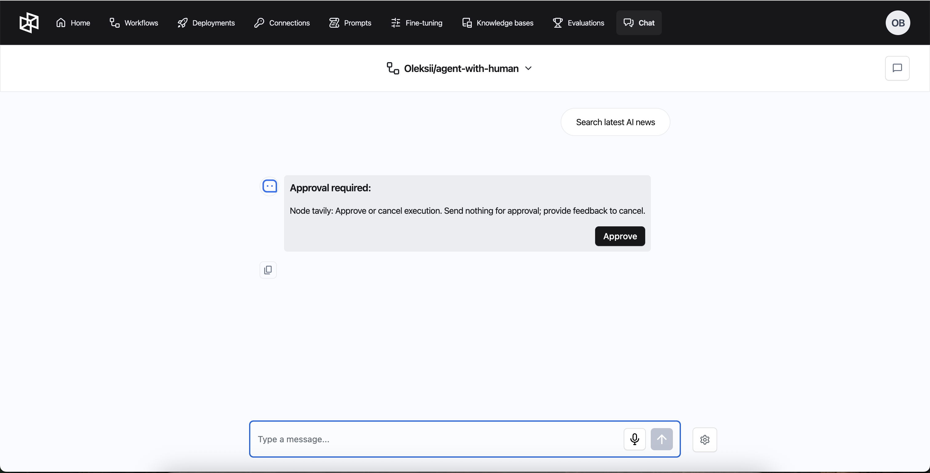 * Open the workflow where you enabled HITL and shubmit a prompt to your agent.&#x20;