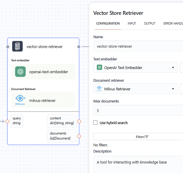 This node allows you to dynamically specify both the embedder and the retriever to suit your use case. It parses and applies all provided parameters through an internal manager, enabling flexible configuration without hardcoding. This design makes it easy to integrate custom retrieval logic tailored to your specific requirements.