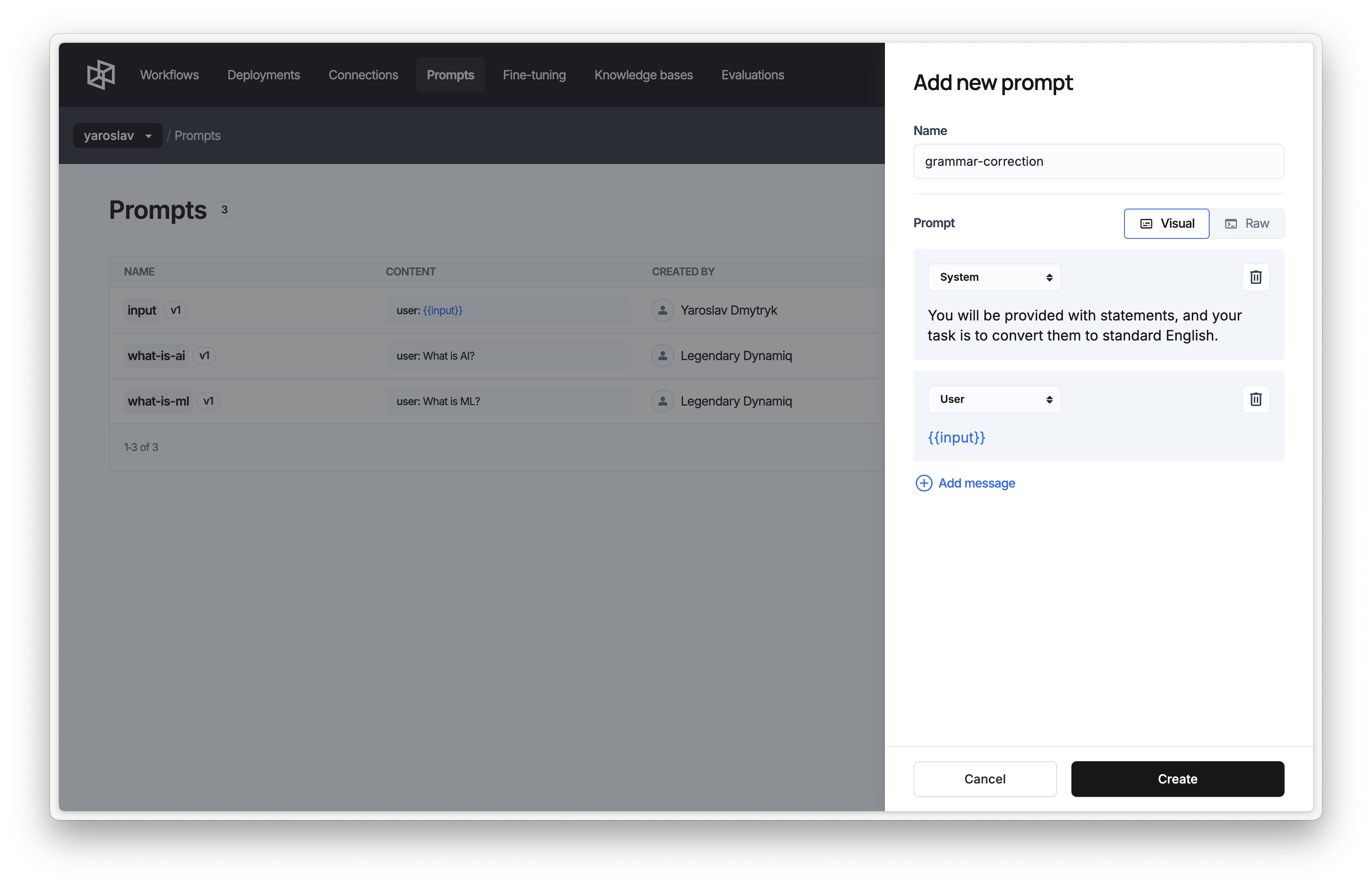Once all fields are filled out, click Create to save the prompt. The system will automatically assign a version